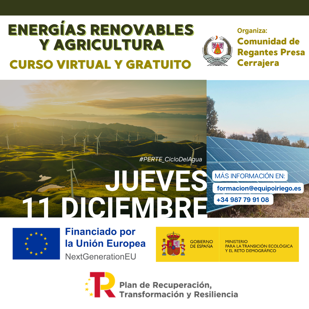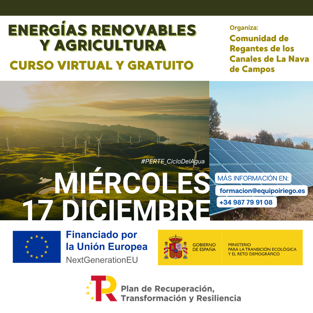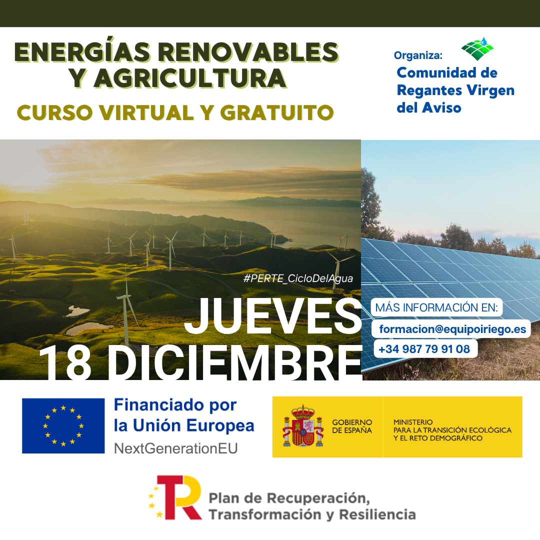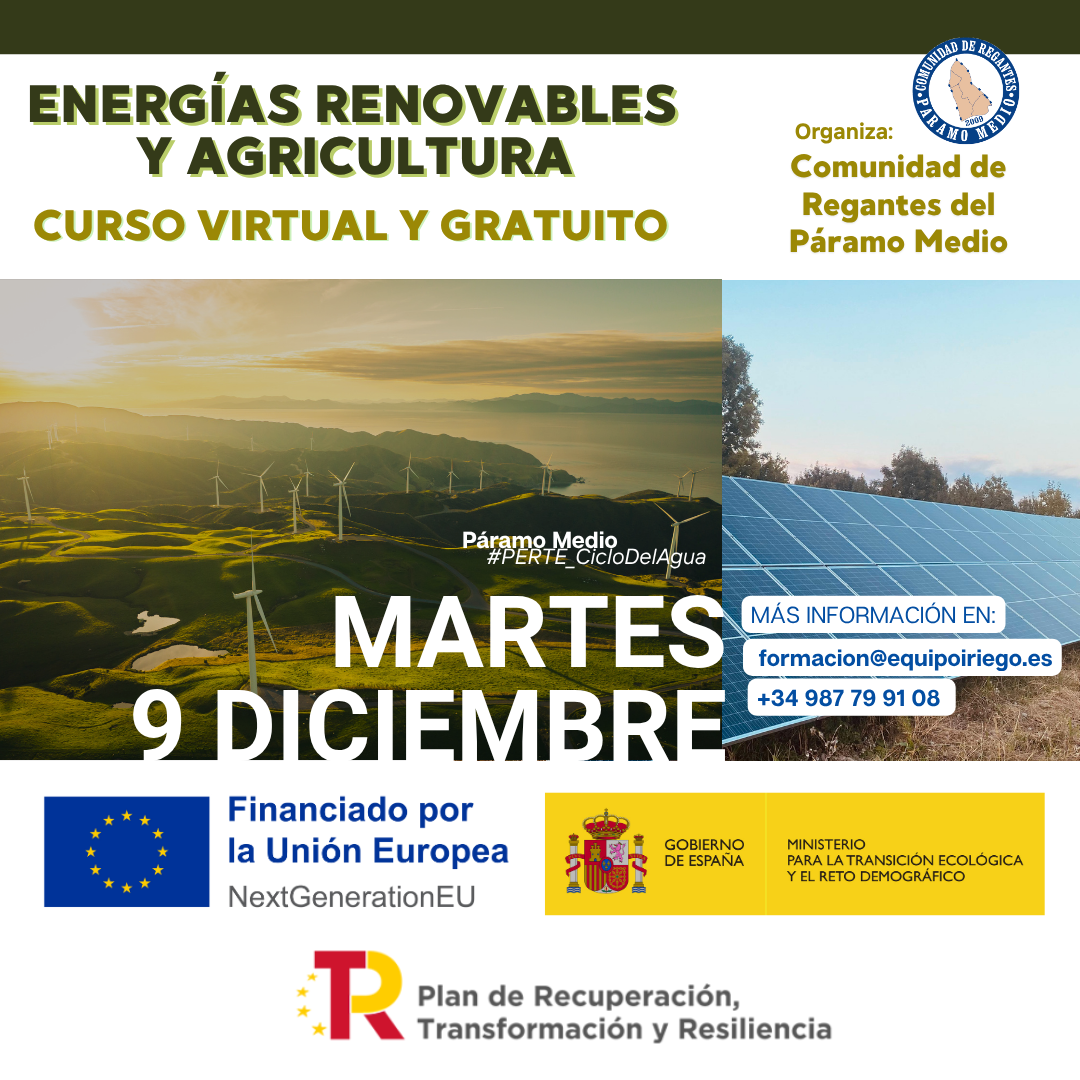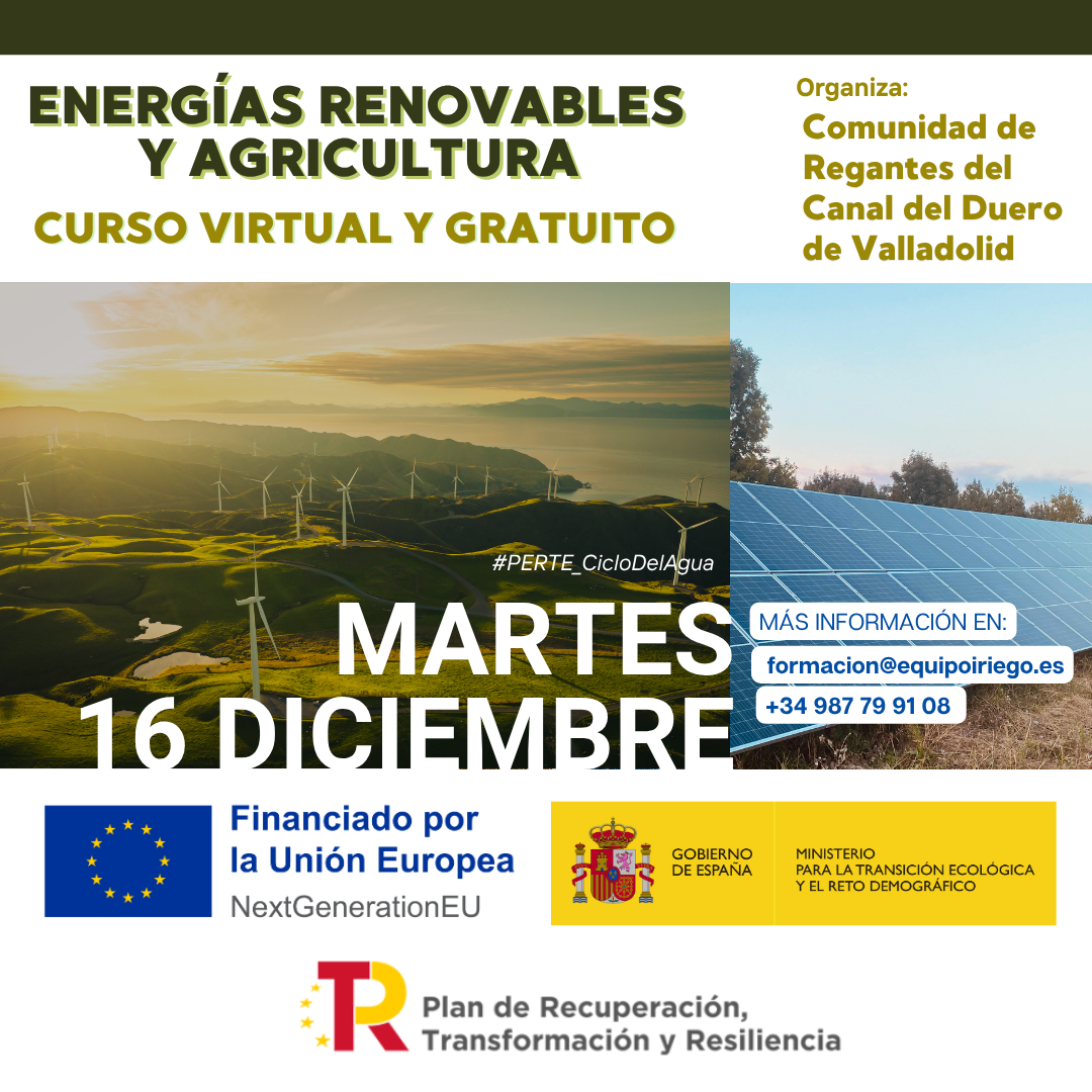 Curso formativo ‘Energías renovables y agricultura'. 9 de diciembre de 2025. Objetivos: Conocimientos sobre la gestión y uso eficiente del agua, buenas prácticas y estructura del regadío modernizado. Modalidad: Virtual y gratuito. Este curso se enmarca en las acciones del Plan de Recuperación, Transformación y Resiliencia, financiado por la Unión Europea- NextGenerationEU, y forma parte […]