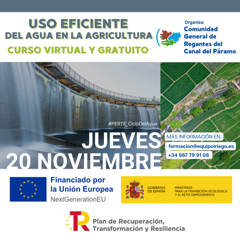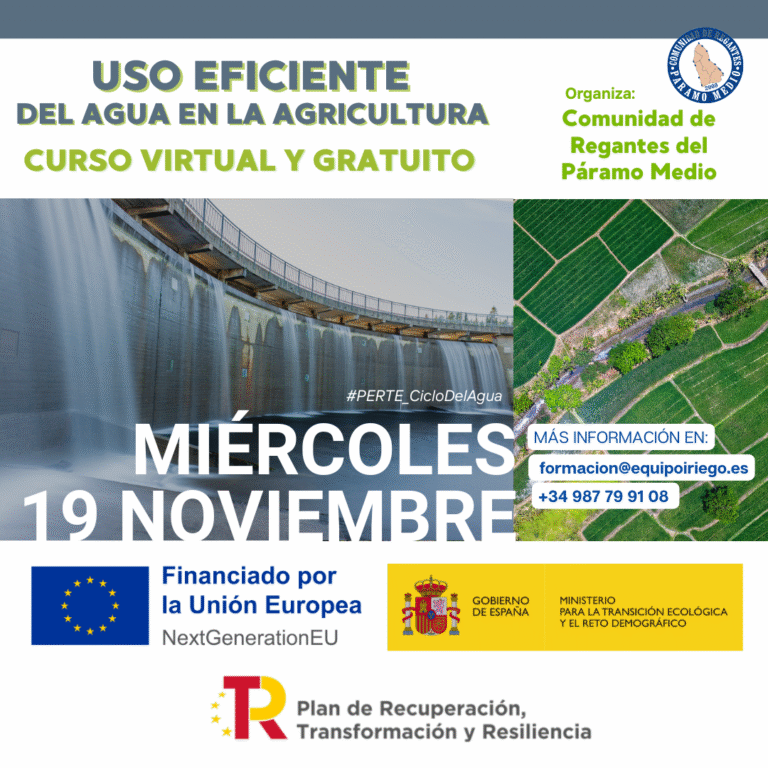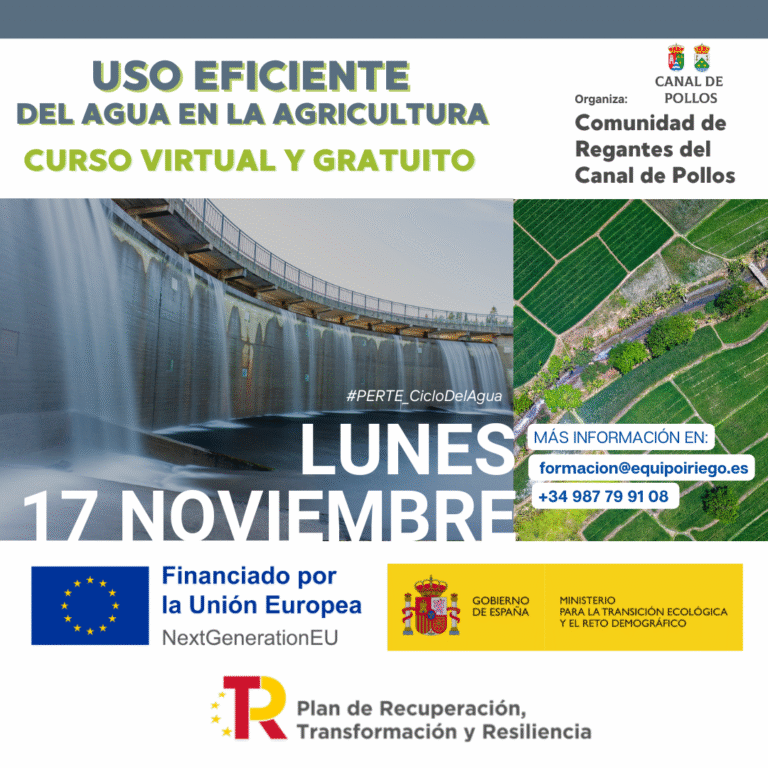 Curso formativo ‘Uso eficiente del agua’. 17 de noviembre de 2025. Objetivos: Conocimientos sobre la gestión y uso eficiente del agua, buenas prácticas y estructura del regadío modernizado. Modalidad: Virtual y gratuito. Este curso se enmarca en las acciones del…