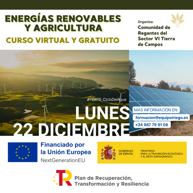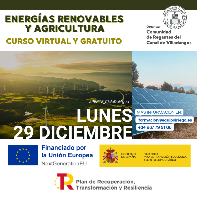 Curso formativo ‘Energías renovables y agricultura’. 29 de diciembre de 2025. Objetivos: Conocimientos sobre la gestión y uso eficiente del agua, buenas prácticas y estructura del regadío modernizado. Modalidad: Virtual y gratuito. Este curso se enmarca en las acciones del…