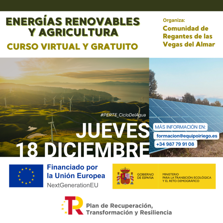 Curso formativo ‘Energías renovables y agricultura’. 19 de diciembre de 2025. Objetivos: Conocimientos sobre la gestión y uso eficiente del agua, buenas prácticas y estructura del regadío modernizado. Modalidad: Virtual y gratuito. Este curso se enmarca en las acciones del…