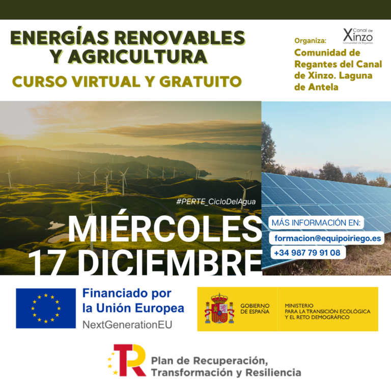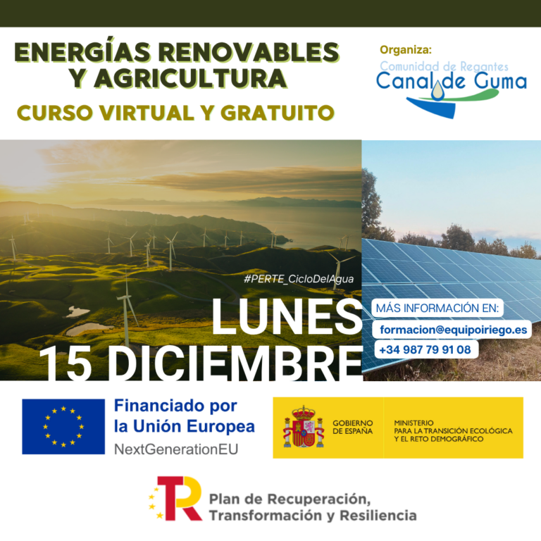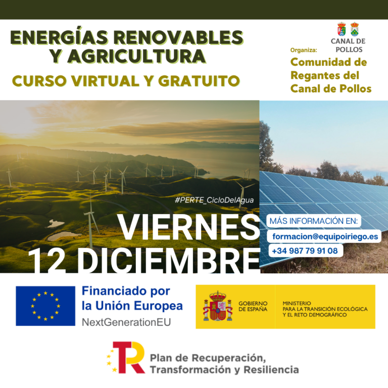 Curso formativo ‘Energías renovables y agricultura’. 12 de diciembre de 2025. Objetivos: Conocimientos sobre la gestión y uso eficiente del agua, buenas prácticas y estructura del regadío modernizado. Modalidad: Virtual y gratuito. Este curso se enmarca en las acciones del…